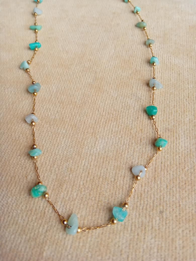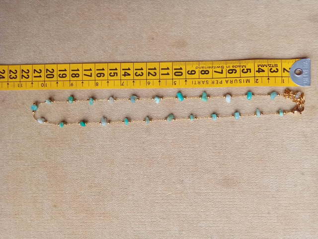 Collana in titanio galvanizzato oro. Non cambia colore e non crea allergie. Con pietre dure in Agata azzurra.