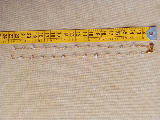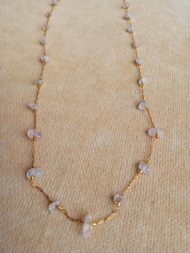Collana in titanio galvanizzato oro. Non cambia colore e non crea allergie. Con pietre dure in quarzo rosa.